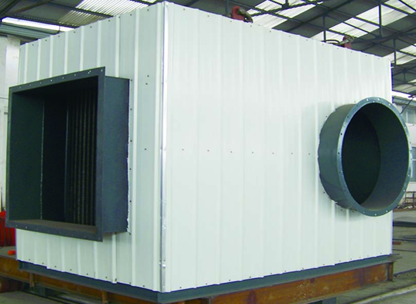 KJQ型礦井空氣加熱器主體結(jié)構(gòu)為空氣加熱器、風(fēng)機(jī)、設(shè)備基座及控制部分構(gòu)成(屬敞開式結(jié)構(gòu)),將其安裝在保溫的空間內(nèi)形成一個(gè)箱體式結(jié)構(gòu)。